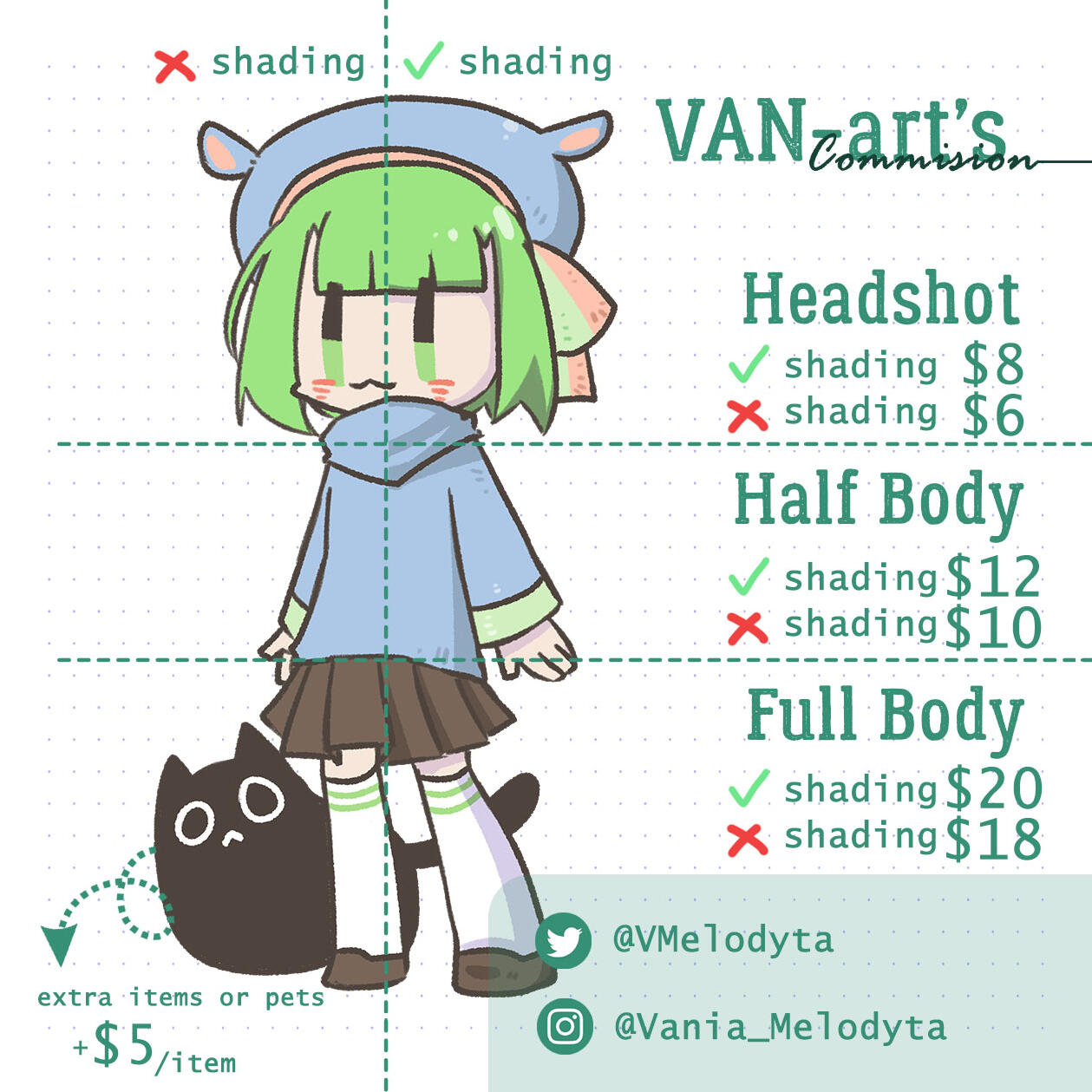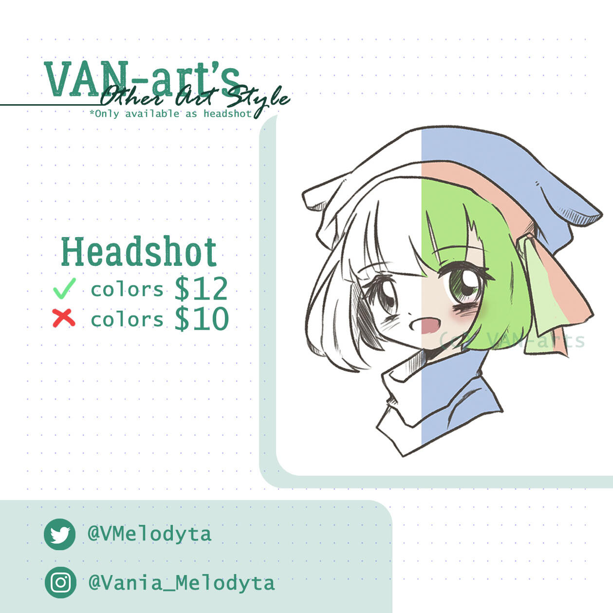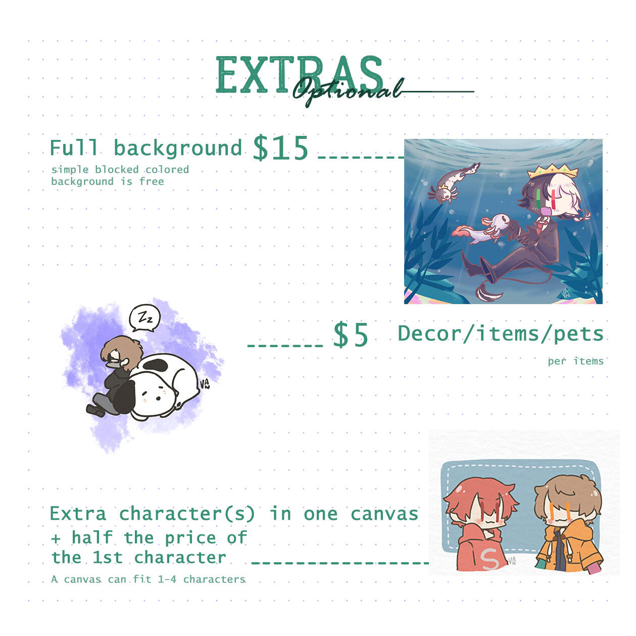 1. This price list is only for personal use commission, DO NOT resell or commercialized in any way and forms. If you want to commission me for commercial stuff, please send me a DM on my socials or email me for there will be price list adjustments :)2. All prices are in US Dollars (USD) and payment using Paypal3. Tips are very much appreciated but won't be necessary :) Thank you so much if you decided to tip me tho!4. DO NOT USE my arts for NFTs, AI art website, or any other Non-fungible and art stealing program5. I will draw original characters, real life people, content creators, fanarts, animals and fictional creatures. I can't draw mecha/complicated robots (like Gundam) and NSFW (the soft gore like small wound are okay!)6. Sketch will be shown in 2-4 days via DM/email after payment and commissioner will have the chance to make changes on the sketch up to 2 times (more than that would charge extra $2 per revision) before I continue the drawing to lining and coloring.7. I'm using canvas size 20x20cm or 20x24cm depends on how the shape/pose of your character(s). If you require different size of canvas, please let me know beforehand.8. You are more than welcomed to post and share your commissioned drawings to your socials (credits won't be necessary but if you do, it would put a smile on my face :)), and I have the right to post them too on my socials for promotion purposes (giant watermarks would be applied to make the clear image only accessible by you). If you don't want me to post your commission online, please let me know9. If you're Indonesian and want to commission me using IDR, DM me :)