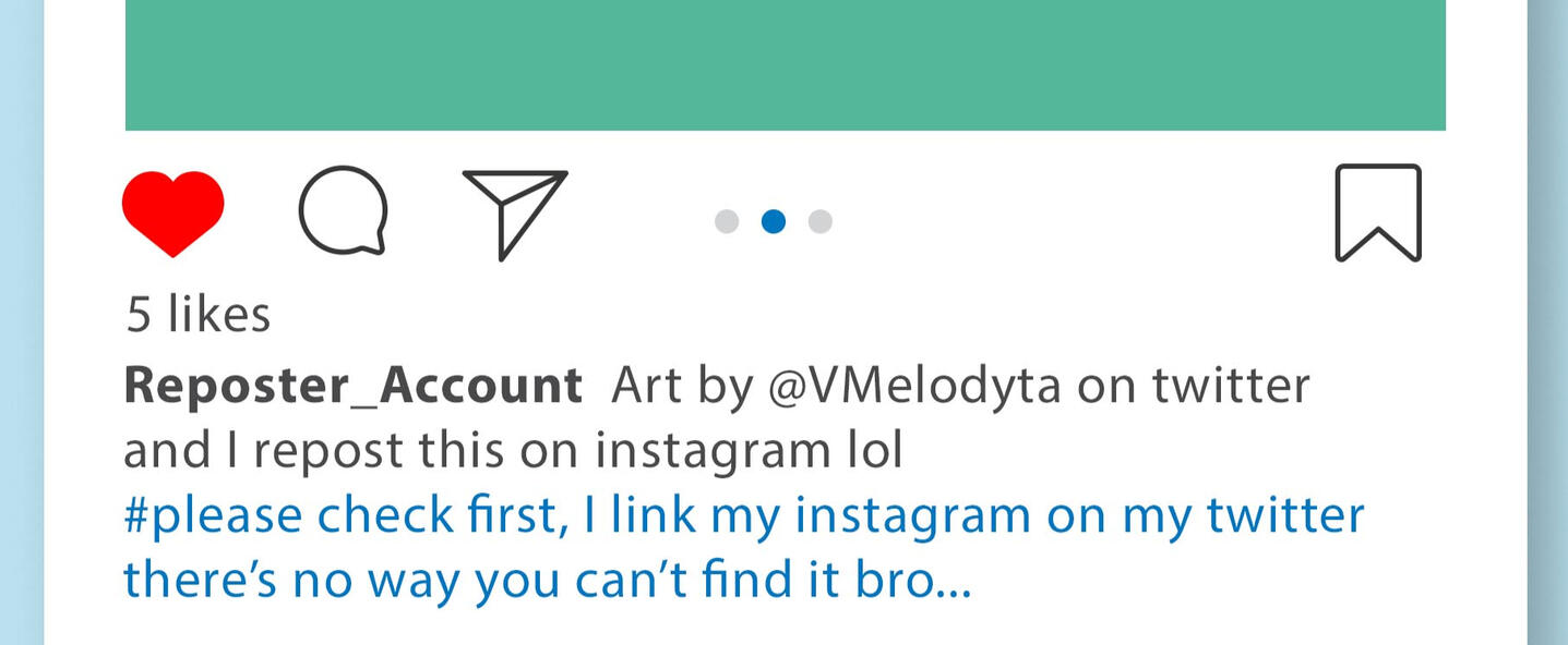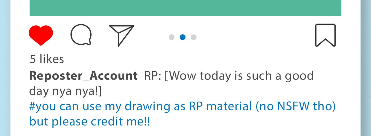 However if you really really really need to repost it, I'd allow it as long as:1. Only repost my art for personal use. Do not commercialized my art for your own profit (example: use it for ads, promoting your own account, basically anything that involves getting you money).2. DO NOT repost and use my arts to promoting hate speech, drama, or anything lawfully wrong.3. Every repost must include proper credits! Tag me on your repost by tagging my @ on the image AND write my @ on the caption, NOT COMMENT. Any reposts that doesn't include proper credits would be considered as stealing arts and will be reported!4. Include the @ of my socials based on where you repost it. If you repost my arts on instagram, then tag my instagram account, same with twitter and tiktok (yes I have Tiktok, I'm looking at you Tiktok art reposters LOL!) If you repost it on a social media that I don't use, you can credits any of my account (instagram or twitter).5. You can only repost arts that been posted on my own social medias after at least 24 hours. Do not repost arts that posted on my own social media in less than 24 hours, you're literally stealing my Reach that way.6. DON'T EVEN TRY TO EDIT OUT OR REMOVE MY WATERMARK I'm serious!7. You don't need to ask me first for reposting permission, just follow all this rules properly and you'll be fine. If you want to ask me first to make sure or ask more questions, it's totally fine too, just shot me a DM :)8. Translations of my comics or using my art on edits are okay, the rules are the same as regular repost :D9. Certain drawings I posted aren't allowed to be reposted, they are included commissioned drawings, personal arts (gifts for
